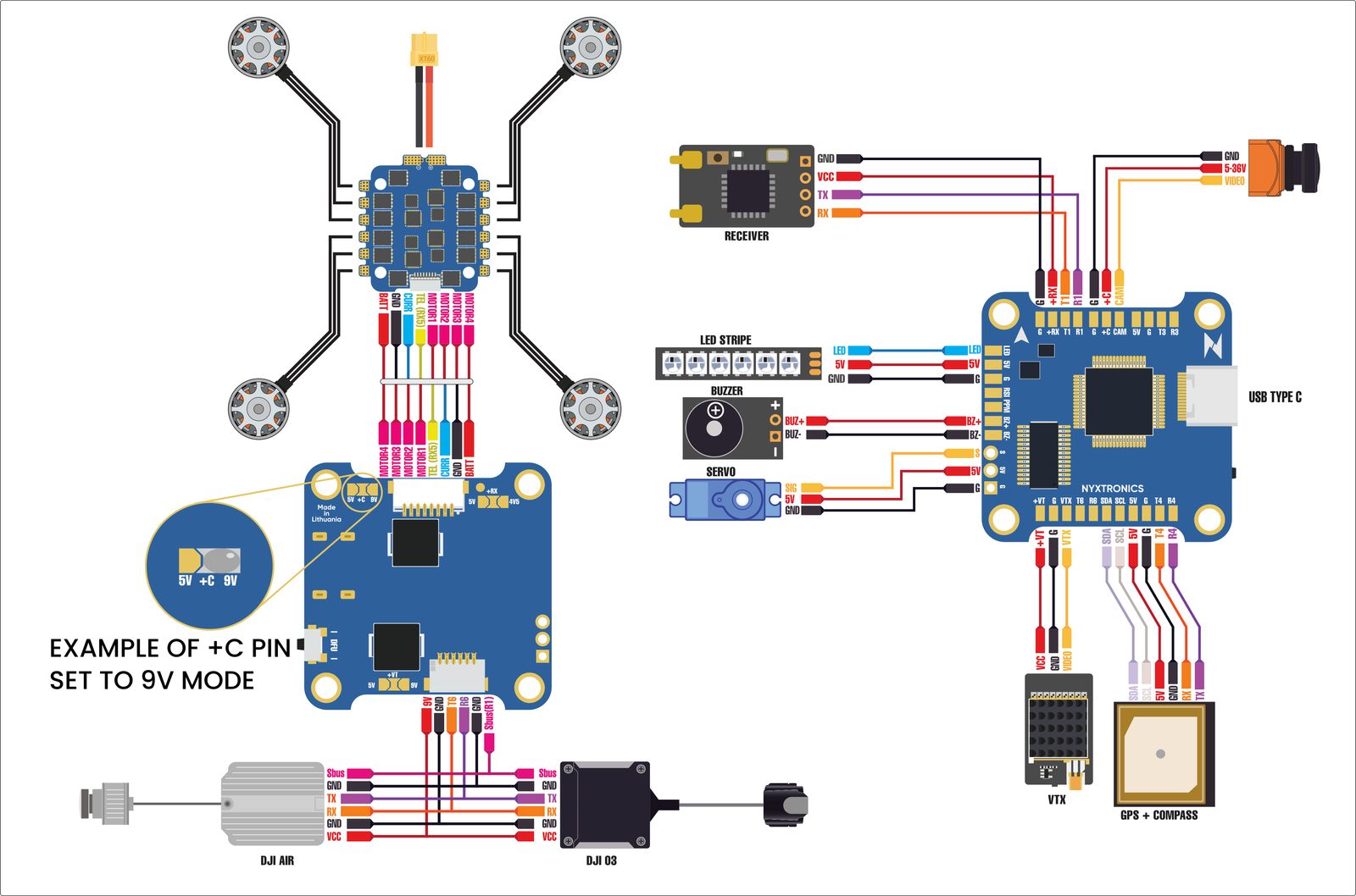 +C (Camera) and +VT (Video trasmitter) pins can be powered from 5V or 9V depending on your hardware needs.